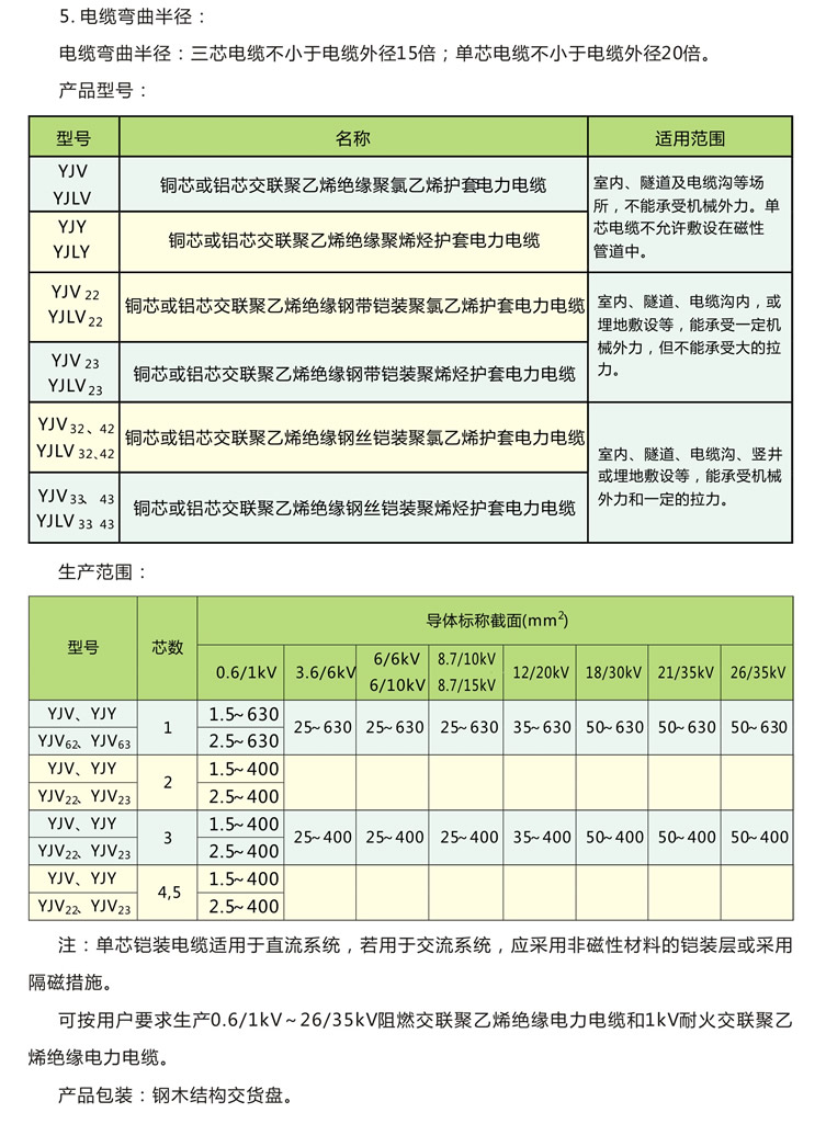 二、使用范圍 工頻額定電壓U0/U:0.6/1kv、1.8/3kv、3.6/6kv、6/6 kv、6/10 kv、8.7/10 kv。