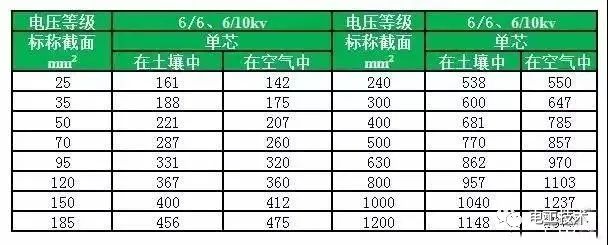 常見電纜的載流量一覽表